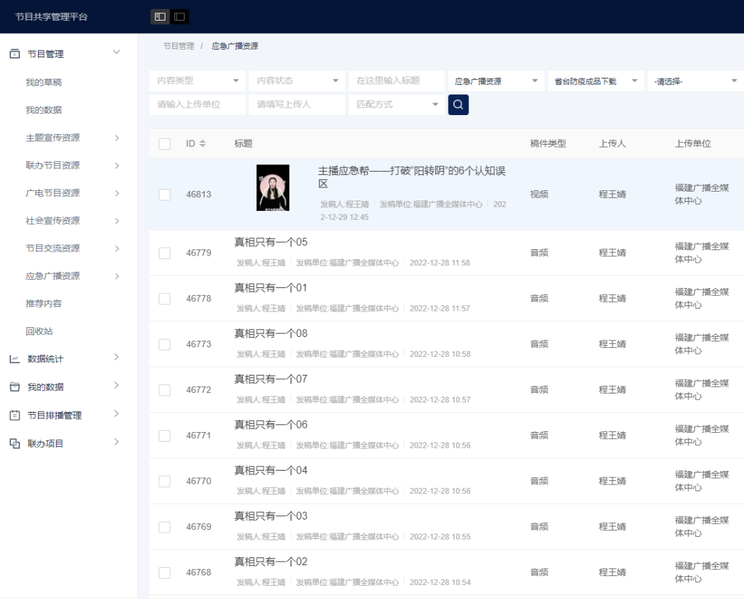 二、加强资源共享。在福建省广播电视节目共享平台设置“防疫作品下载”专区。福建交通应急广播策划制作了一系列指导群众正确防范新冠病毒感染、正确备药用药的音视频节目上传专区,供各地广播机构或融媒体中心下载使用,目前已经上线音视频节目52条。福建省广播电视节目共享平台还同步联通村村响“大喇叭”,将疫情防控科学备药用药的有关知识、讯息传递到千家万户,打通疫情防控宣传和服务的“最后一公里”。