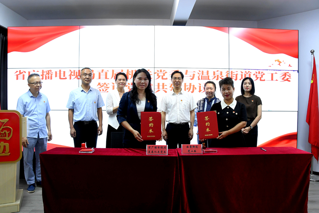 7 月 1 日,省广电局与鼓楼区河东社区共同举办“携手同心庆‘七一’ 结对共建促提升”共建活动暨智融宣传屏捐赠仪式,局党组成员、副局长、机关党委书记陈炎铭与温泉街道党工委书记张林为智融宣传屏揭牌,局直属机关党委与温泉街道党工委签订党建共建协议。局机关、局属单位各支部党员代表和温泉街道党工委、各社区(经合社)书记20余人参加共建活动。