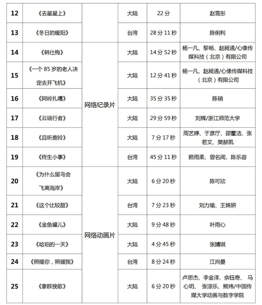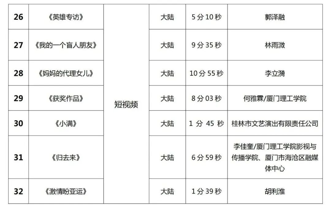 ▲入围提名作品名录(排序不分先后) 两岸青年影人作为最富有活力和创造力的群体,他们的踊跃参与,使得本届作品整体品质较往年有进一步的提升。