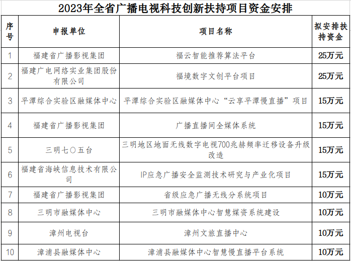 关于2023年全省广播电视科技创新扶持项目名单及专项资金安排情况的公示
