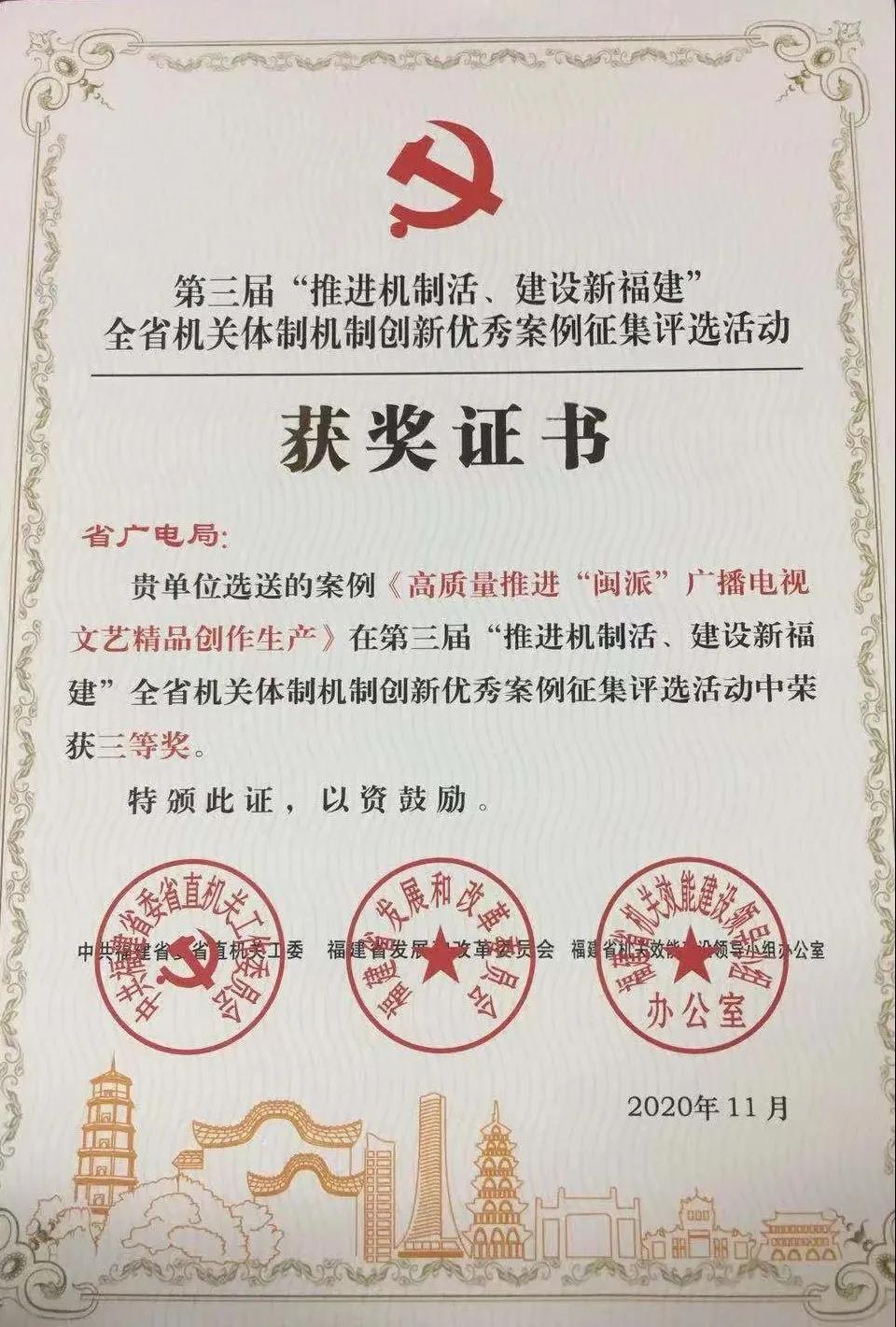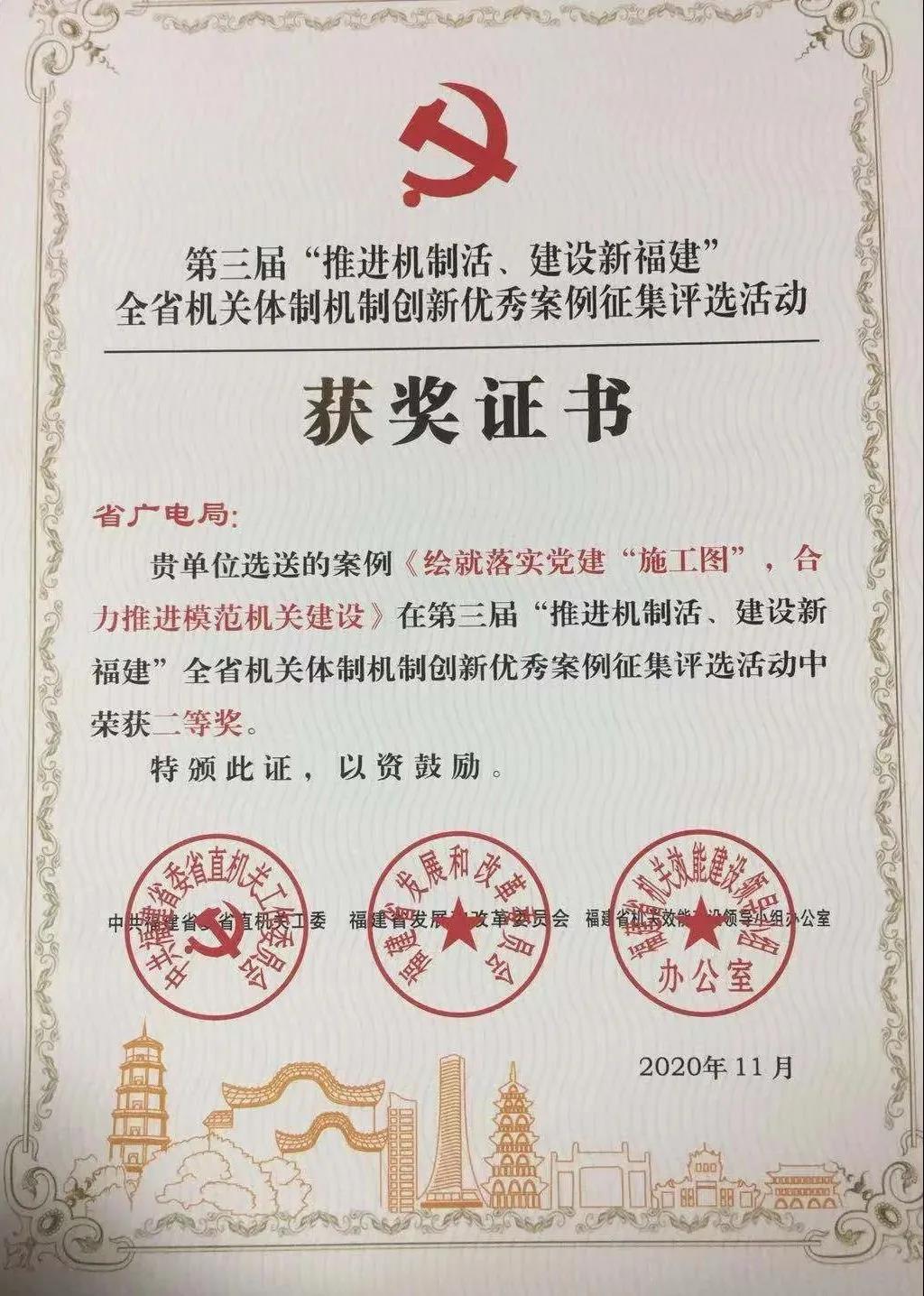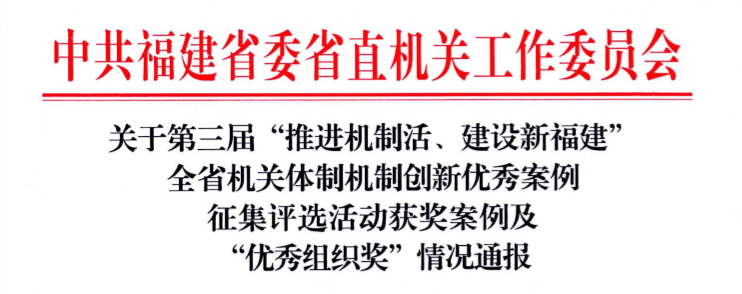 日前,省直机关工委、省发改委、省效能办发出通报,公布第三届“推进机制活、建设新福建”全省机关体制机制创新优秀案例征集评选活动获奖案例及“优秀组织奖”名单。省广电局选送的《绘就落实党建“施工图”,合力推进模范机关建设》荣获党建类二等奖,《高质量推进“闽派”广播电视文艺精品创作生产》荣获非党建类三等奖。