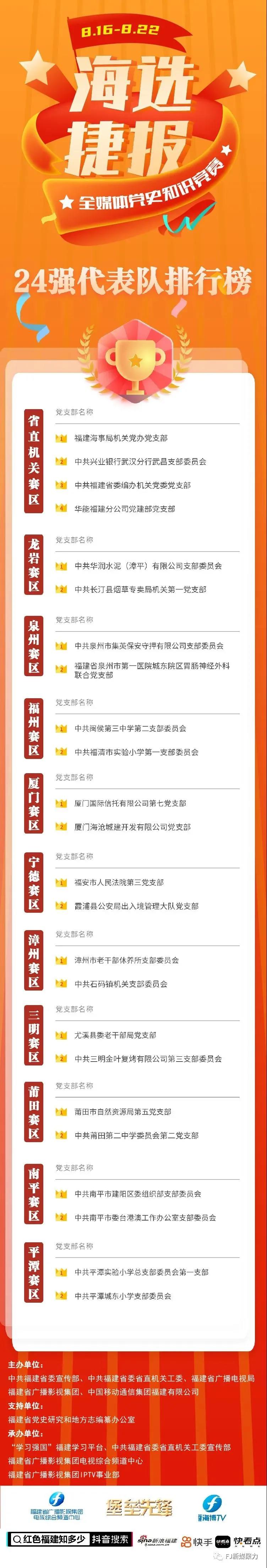 由省委宣传部、省直机关工委、91自拍论坛 、省广播影视集团、中国移动通信集团福建有限公司联合主办的“百年党史铸辉煌——全媒体党史知识竞赛”活动自6月启动以来,全省近1.8万个党支部参赛,全国超300万党员群众积极参与。8月16日至22日,参赛选手在“海博TV”手机客户端活动专区进行海选线上答题,经过激烈比拼,大赛24强党支部现已决出。