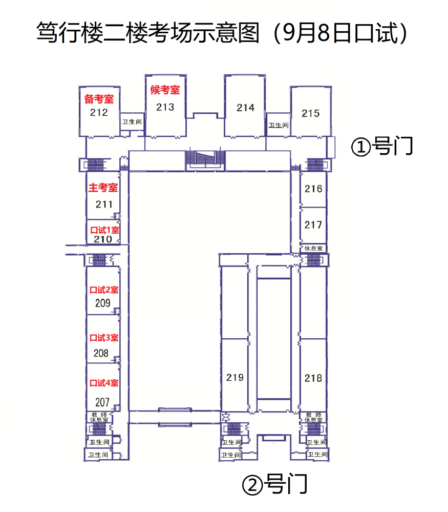 2、参加8日上午口试的全体考生在08:30前到达考点候考室(笃行楼213)点名,准备考试;下午口试的全体考生在13:00前到达考点候考室点名,准备考试。超过点名时间,视为弃考。考试开始30分钟(含)后,考场关闭,禁止人员进入。