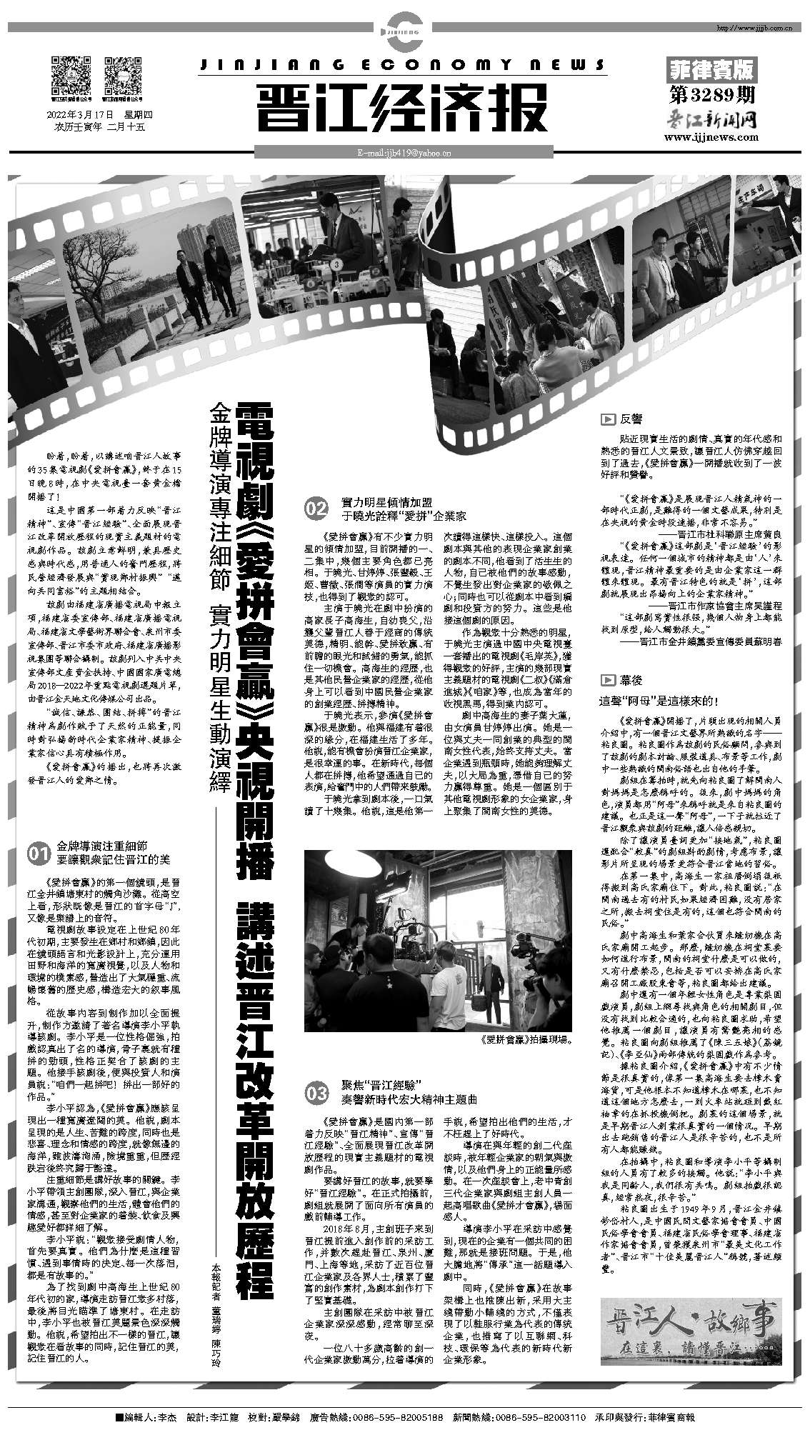 “《爱拼会赢》是展现晋江人精气神的一部时代正剧,是难得的一个文艺成果,特别是在央视的黄金时段连播,非常不容易。”