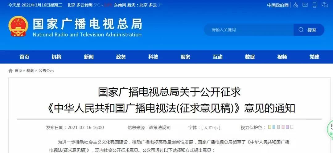 通知指出,为进一步推动社会主义文化强国建设,推动广播电视高质量创新性发展,国家广播电视总局起草了《中华人民共和国广播电视法(征求意见稿)》,现向社会公开征求意见。公众可通过以下途径和方式提出意见:1、通过信函方式将意见寄至:北京市西城区复兴门外大街2号国家广播电视总局政策法规司(邮编:100866)。2、通过电子邮件方式将意见发送至[email protected]。3、请传真至010-86093288。意见反馈截止时间为2021年4月16日。为什么要制订广播电视法为深入贯彻习近平法治思想,落实党的十九届五中全会精神,推进社会主义文化强国建设,推动广播电视高质量创新性发展,促进满足人民文化需求和增强人民精神力量相统一,根据中办国办《关于加快推进媒体深度融合发展的意见》要求,和有关国家文化立法工作安排,国家广播电视总局在《广播电视管理条例》等现行法规基础上,深入开展调查研究,广泛征求地方广播电视主管部门、广播电视网络视听从业机构以及中央有关单位意见,多次召开专家学者座谈会,反复修改完善,形成了《中华人民共和国广播电视法(征求意见稿)》(以下简称征求意见稿)。一、立法目的(一)推动实现广播电视领域加强党的领导和全面依法治国融为一体。制订广播电视法,是广播电视领域贯彻落实习近平法治思想的重要举措,通过立法,明确坚持和加强中国共产党对广播电视工作的领导,以马克思列宁主义、毛泽东思想、邓小平理论、“三个代表”重要思想、科学发展观、习近平新时代中国特色社会主义思想为指导,坚持正确的政治方向、舆论导向、价值取向,坚定文化自信,坚持为人民服务、为社会主义服务,坚持把社会效益放在首位、社会效益和经济效益相统一等基本原则,推动社会主义核心价值观入法入规,推动法治国家、法治政府、法治社会建设。(二)为广播电视更好地满足人民群众精神文化需求提供制度保障。广播电视是文化事业产业建设发展的重要领域,担负着弘扬主旋律、传播正能量、满足人民群众精神文化生活需求的重要责任,在促进国家经济社会发展中发挥着重要作用。在此次全民疫情防控中,广播电视通过网上网下一体联动,发挥了舆论宣传引导、公共服务、应急管理等多方面积极作用。制定行业基本法,将会更好地保障广播电视行业坚持以人民为中心的工作导向,服务于经济社会发展全局,为人民群众提供更加优质的广播电视服务。(三)为构建全媒体传播体系提供法治支撑。广播电视是全媒体中的重要内容。随着媒体融合走向深入,全媒体传播已经成为主流趋势,融媒体中心等机构成为广播电视业务的开办机构,现行《广播电视管理条例》设定的以广播电台、电视台设立审批为主的管理体制,已经不再适应这一新的发展和管理需求。当前,迫切需要根据全媒体时代特点,从法律层面做好广播电视管理体系的顶层设计。(四)提升广播电视领域依法行政能力。广播电视领域长期存在基础立法缺位、法规规章制定依据不足等问题,行业法治建设相对滞后于行业发展实际需要。随着广播电视节目制作等部分业务向社会放开,特别是近年来网络视听等广播电视新业务快速发展,从业主体和从业人员越来越多,群众参与度和社会关注度越来越高,广播电视管理部门的依法行政能力迫切需要得到进一步提升,迫切需要通过国家层面立法,以点带面,逐步建立一套完备的广播电视法律体系,形成良法善治新格局。对此,社会各界和各级各类广播电视机构呼声很高。二、立法的指导思想深入贯彻习近平新时代中国特色社会主义思想,坚持马克思主义在意识形态领域的指导地位,聚焦贯彻落实习近平法治思想,聚焦有效回应人民群众新期盼,推动新时期广播电视高质量发展,满足人民精神文化生活需求,牢牢把握党管宣传、党管意识形态、党管媒体的原则和要求,聚焦社会主义核心价值观融入法治建设,坚持以人民为中心,坚定文化自信,坚持守正创新,融合发展与扶持促进并举,公共服务和内容规范并重,推进文化强国建设。三、征求意见稿拟设定的主要制度、措施征求意见稿分为总则、业务准入、制作播放、传输覆盖、公共服务、扶持促进、安全保障、监督管理、法律责任和附则,共10章80条。拟设定的主要制度、措施包括:(一)坚持以人民为中心,为提供更多更好的广播电视节目提供法制保障。征求意见稿规定国家建立节目创新创作扶持制度、节目综合评价制度、节目播出调控制度、未成年人保护制度、从业人员管理制度、广告播放管理制度等,保障人民群众收看到满意的广播电视节目。对广播电视公共服务的主要任务和标准化、均等化建设提出要求。明确国家推进应急广播建设,将应急广播纳入应急管理体系和公共文化服务体系并推动应用,充分发挥其在防灾避险方面的作用。(二)加强智慧广播电视建设,推动广播电视深度融合发展。征求意见稿明确国家加强智慧广播电视建设,推动广播电视科技创新与服务升级,推进广播电视在全媒体传播体系中深度融合发展,为国家经济社会发展提供智慧广播电视服务。同时在业务准入管理制度上,将广播电视活动按照生产传播链条分为制作发行、集成播放、传输覆盖三个环节,将广播电台、电视台、融媒体中心、视频网站、IPTV集成和传输机构、互联网电视平台等各类播出平台和各类节目制