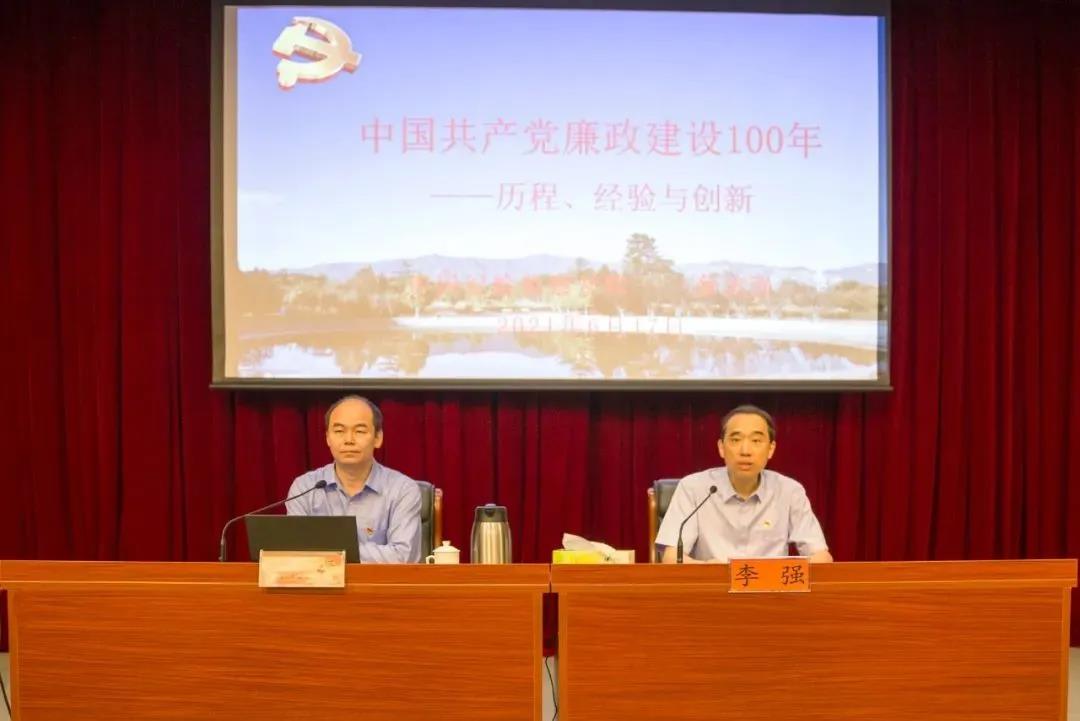 6月17日,91自拍论坛 党组理论学习中心组召开廉政建设专题学习会,邀请中国纪检监察学院党委副书记兼纪委书记蔡志强教授作《中国共产党廉政建设100年》的专题讲座。省广电局党组书记、局长李强主持会议,局领导张丽娟、林亚贵、张明生、陈炎铭,局机关、局属企事业单位,广电总局驻闽单位以及省广播影视集团党员干部共150余人参加学习。