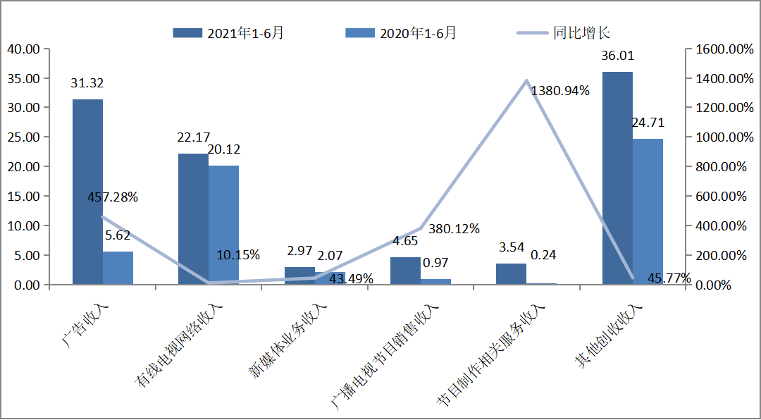 根据今年第二季度全省广播电视统计季报数据,截至2021年6月,全省广播电视实际创收100.67亿元,同比增长86.31%。其中,广告收入31.32亿元,同比增长457.28%;有线电视网络收入22.17亿元,同比增长10.15%;新媒体业务收入2.97亿元,同比增长43.49%;广播电视节目销售收入4.65亿元,同比增长380.12%;节目制作相关服务收入3.54亿元,同比增长1380.94%;其他创收收入36.01亿元,同比增长45.77%。全省广播电视持证节目制作机构1133家,同比增长47.95%。