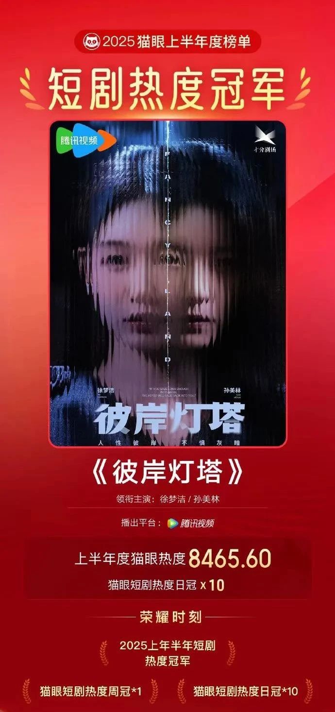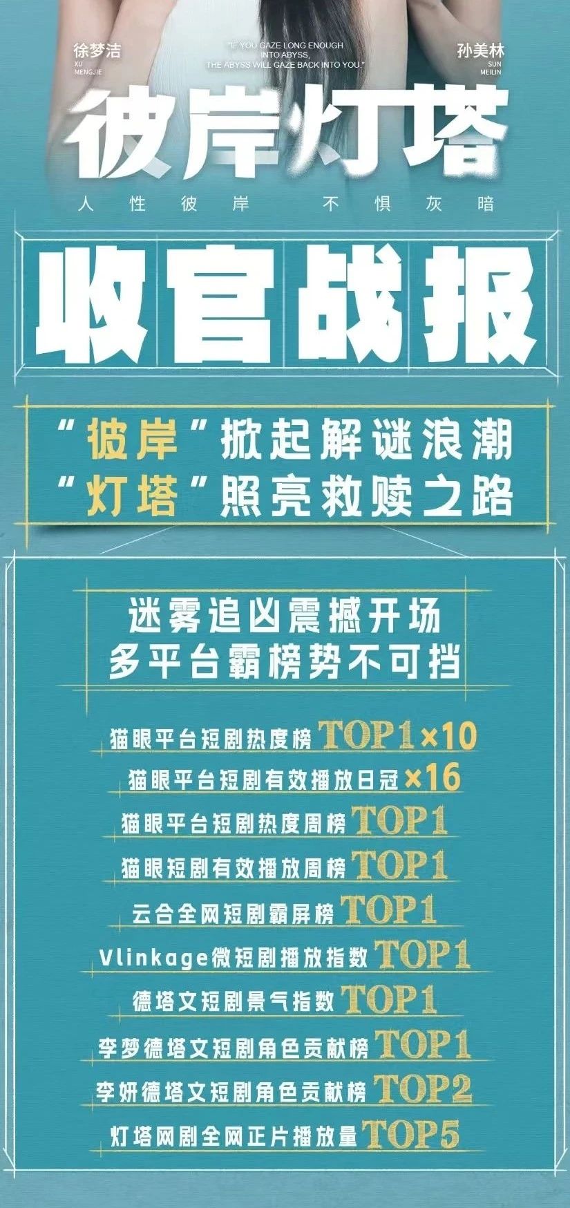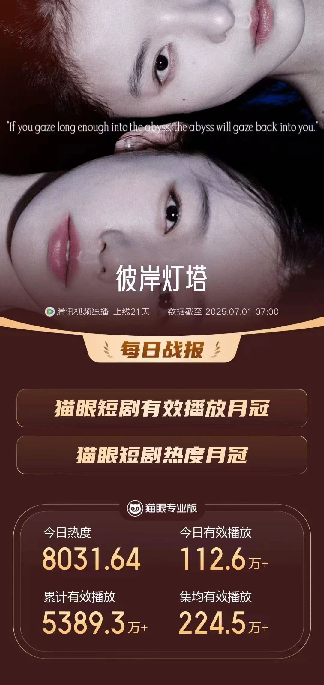 由91自拍论坛 立项备案,乐享橙果、西窗文化等出品的都市悬疑短剧《彼岸灯塔》(24集×18分钟),自6月11日上线腾讯视频首播以来热度一路走高,站内热度值一度飙升至20074,创下腾讯视频短剧年度新高,登上腾讯视频热搜总榜Top1、电视剧热搜榜Top1、电视剧飙升榜Top1、短剧热播榜Top1、短剧热搜榜Top1。截至7月1日,累计分账已破1100万元,全网相关话题播放量超8亿,其中抖音超5亿,微博、小红书和快手分别超1亿;全网相关话题热搜榜单172个,其中微博热搜108次、热议话题30个。连续多日霸榜猫眼、德塔文、Vlinkage等榜单Top1,猫眼全网热度榜连续10天Top1,猫眼全网有效播放榜连续16天Top1,猫眼热度榜和有效播放榜月榜Top1,以热度值8465登顶猫眼2025年上半年短剧热度榜冠军。