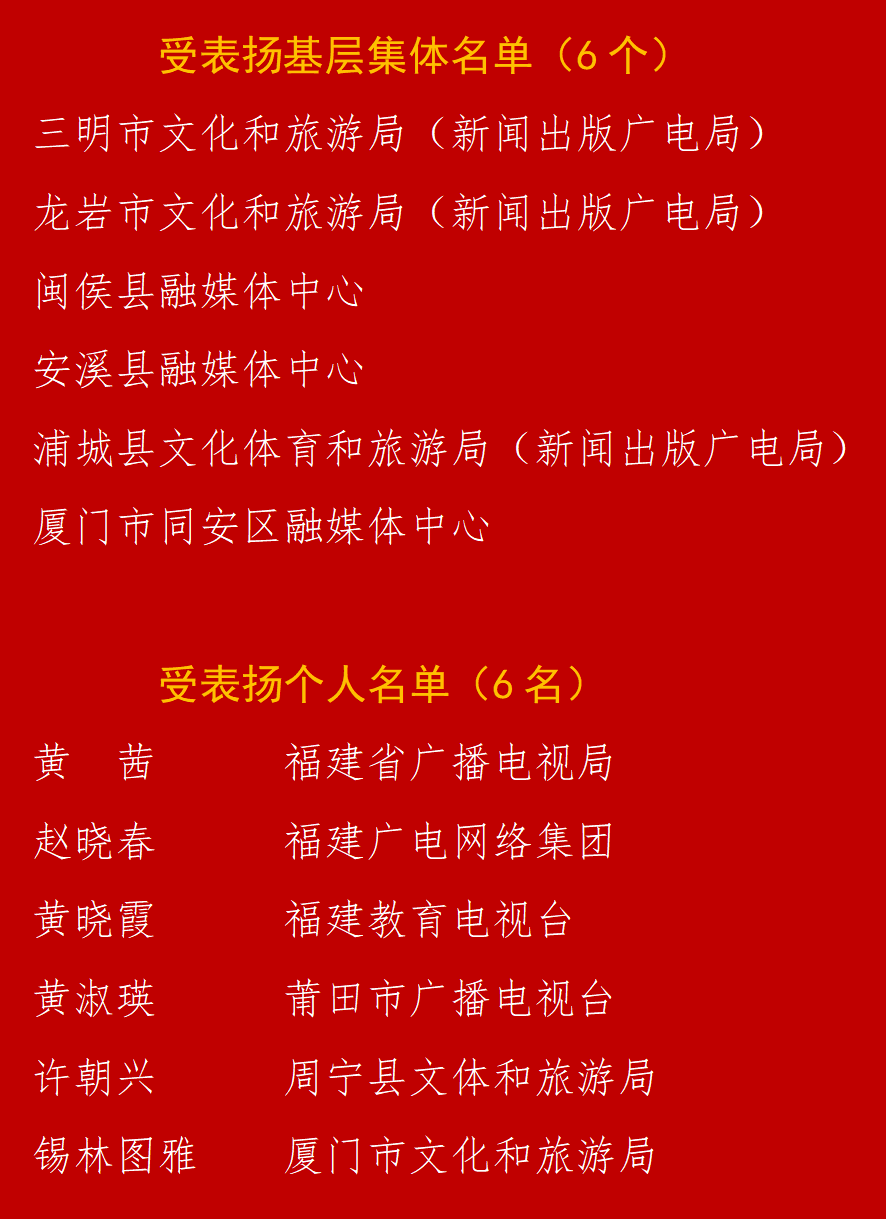 近日,国家广电总局发布通报,对全国广电系统2024年度统计工作中表现突出的单位和个人予以通报表扬。我省三明市文化和旅游局(新闻出版广电局)等6个基层集体、黄茜等6名个人获国家广电总局通报表扬。