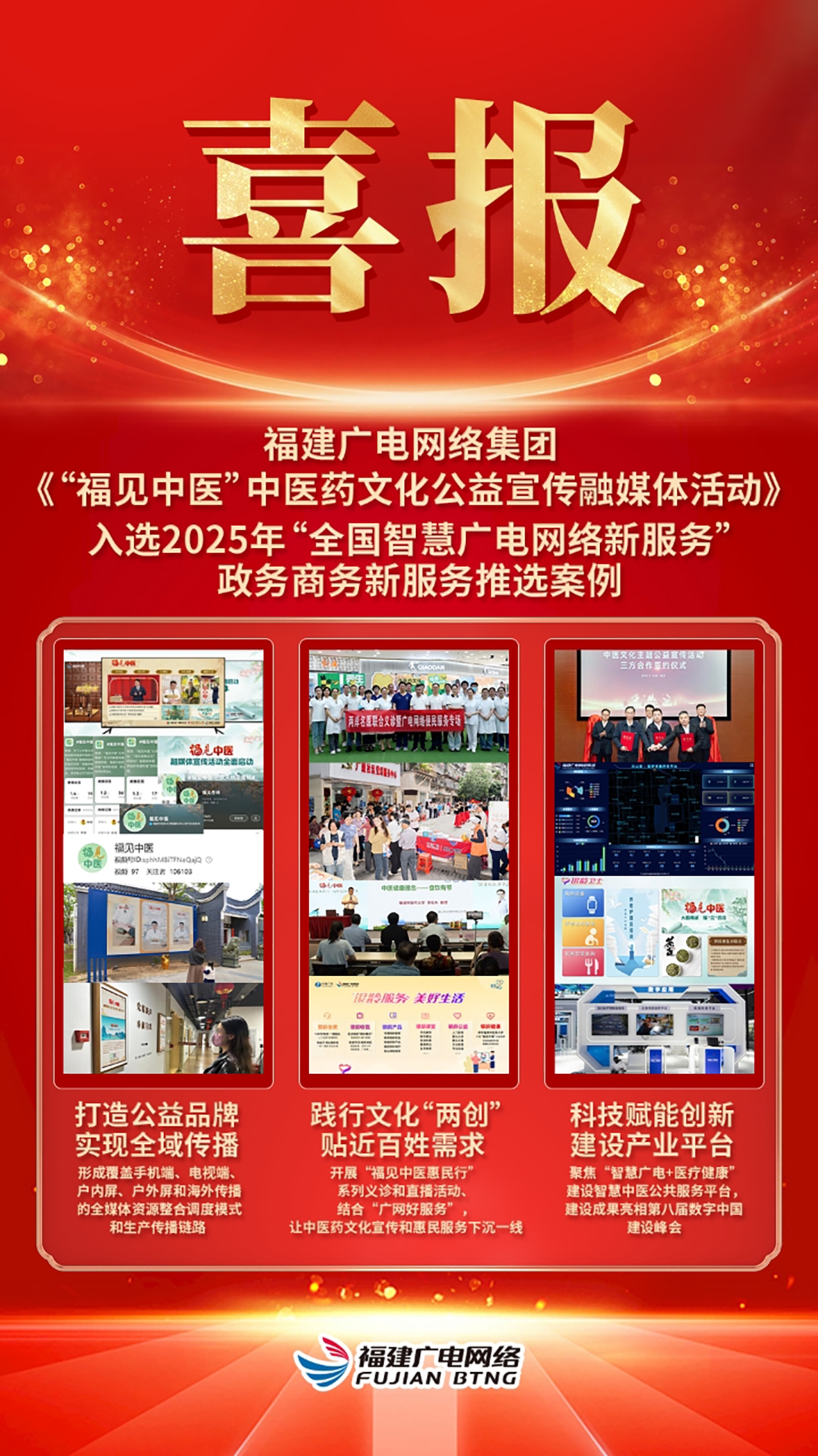 近日,国家广播电视总局公布2025年“全国智慧广电网络新服务”推选结果,福建广电网络集团申报的“‘福见中医’中医药文化公益宣传融媒体活动”项目从全国数百个案例中脱颖而出,获评“全国智慧广电网络新服务”政务商务新服务类案例(全国仅入选8例)。