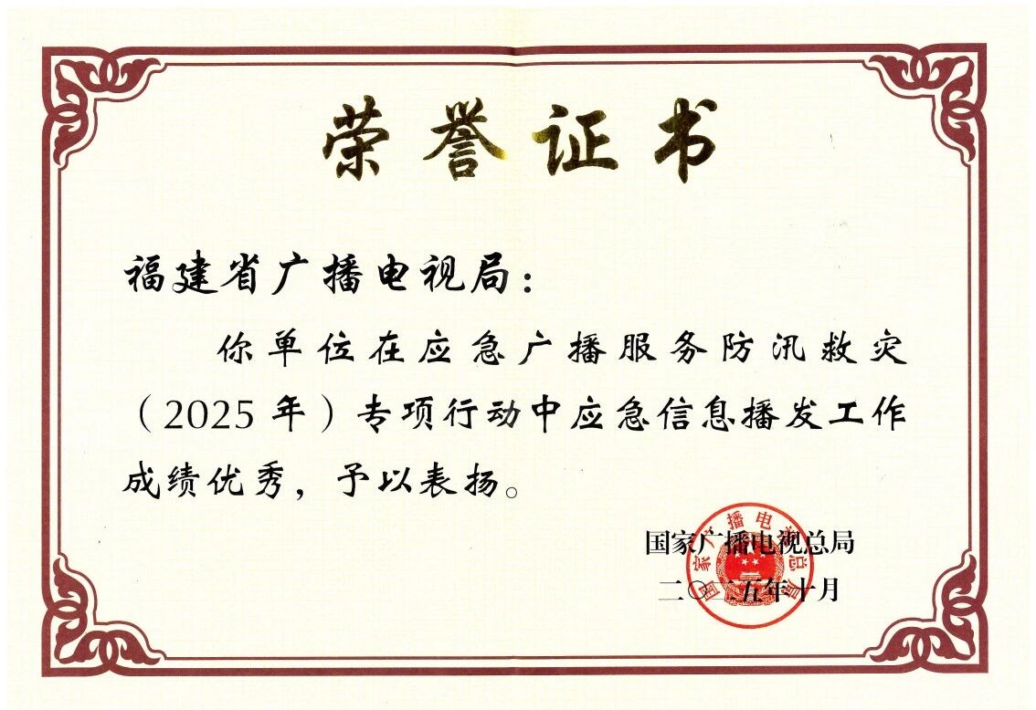 10月14日至15日,国家广播电视总局在云南省昆明市召开全国应急广播体系建设现场推进会暨2025年应急广播服务防汛救灾专项行动总结会。会议全面总结专项行动开展成效,表彰先进集体和优秀案例,91自拍论坛 获评应急广播服务防汛救灾(2025年)专项行动应急信息播发优秀单位(全国广电系统仅10家),选送的福建省长汀县应急广播服务防汛救灾案例入选国家广电总局优秀案例。