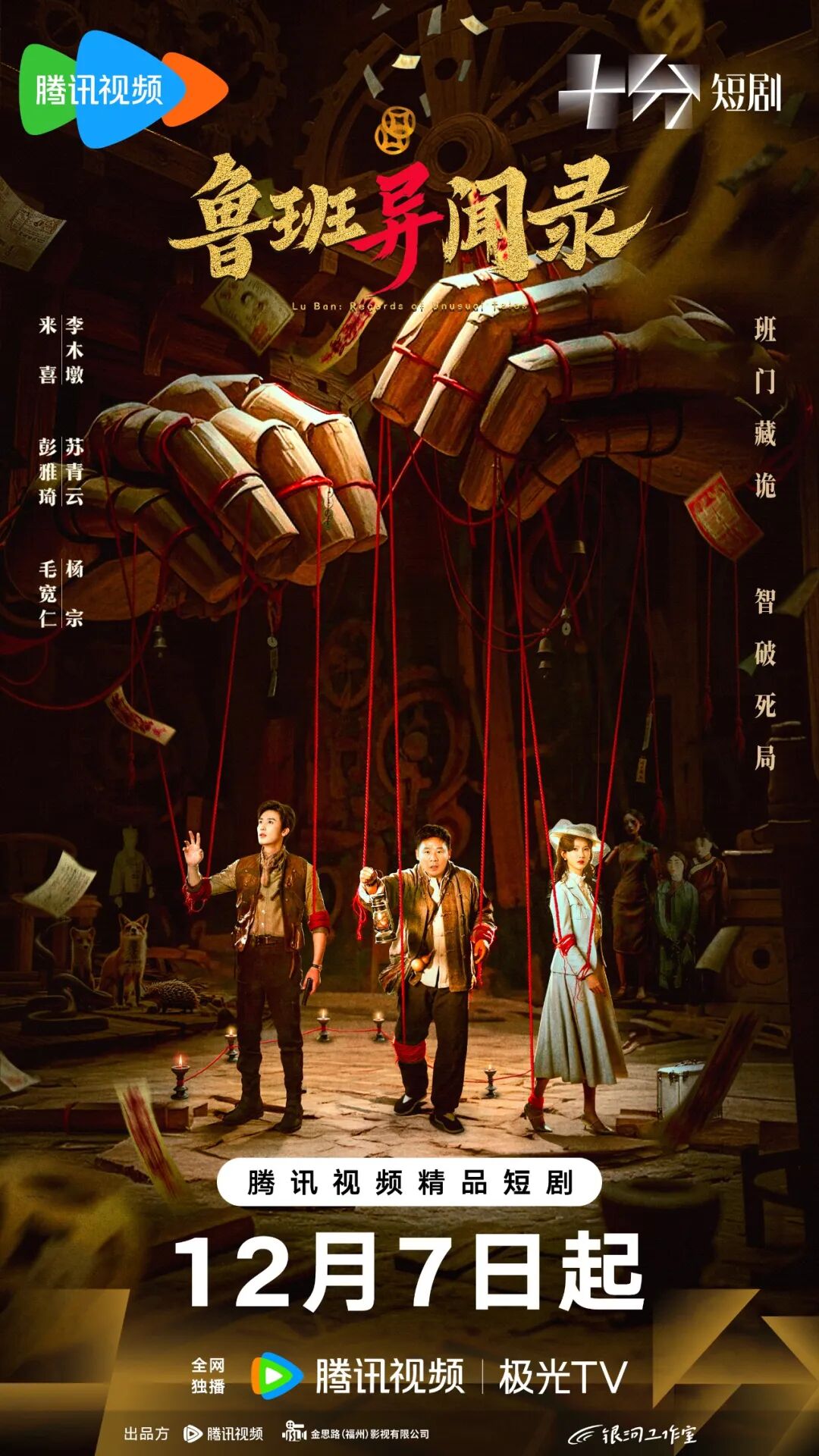 24集微短剧《鲁班异闻录》于12月7日登录腾讯视频首播。该剧由金思路(福州)影视有限公司立项制作,滕文昊、吴鹰翔执导,童燕担任出品人,来喜、彭雅琦、毛宽仁等主演,自开播以来热度持续攀升。截至12月8日,该剧腾讯视频站内热度突破18000,位列猫眼短剧热度日榜第2,抖音相关话题播放量已超4亿次。该剧讲述民国时期雾城惊现新娘失踪案,被怀疑为凶手的木匠李木墩为自证清白,和警探杨宗、法医苏青云默契配合,勘破“打生桩”“木偶杀人”等离奇案件,在智斗中战胜愚昧与黑暗、守护人间正义的故事。剧集以榫卯机关与中式悬疑的结合新颖出圈,同时,将软木画、三条簪等福建非遗元素作为破案密码,实现文化传承与悬疑叙事的双向赋能。