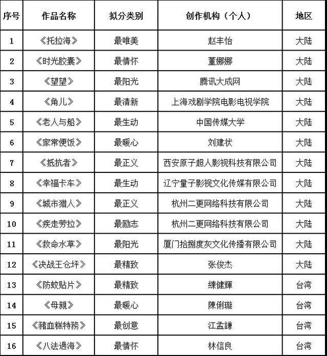 根据活动方案和计划安排,2019年5月15日~17日,2019“海峡影视季——第四届两岸青年微电影展”组委会特邀专家学者、行业机构、监管部门等方面的8位评委参与初审工作。根据本届微电影展评审会评分标准和推选规则,经过各位专家评委认真评审、投票,最终评审会确定16部入围提名作品,名单如下(排名不分先后):
