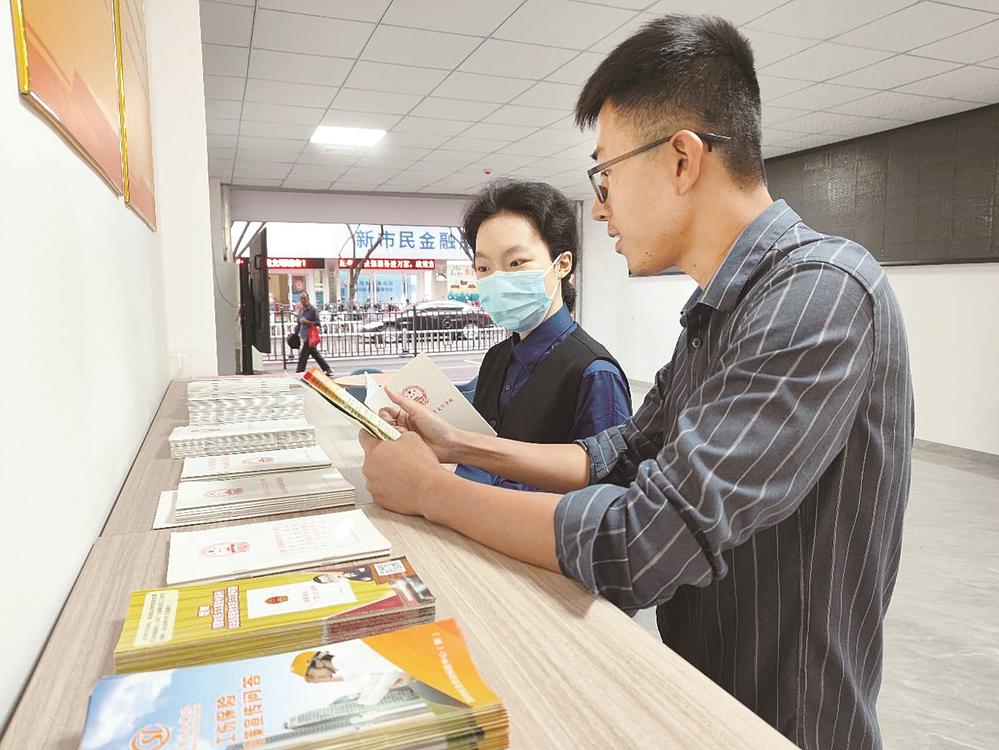来到政策咨询区,《电子社保卡申领操作指南》《灵活就业人员医保缴费指南》《中华人民共和国劳动法》《中华人民共和国社会保险法》等被印刷成册,整齐摆放在柜台上供市民查阅,还有工作人员在旁提供咨询讲解服务。